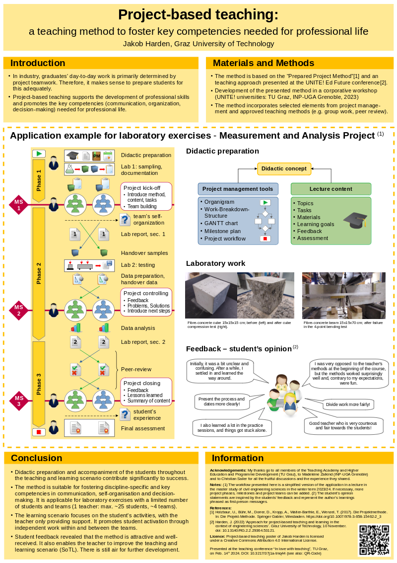 This data set consists of the conference poster (.pdf) and the associated data (*.odp). The poster was presented as part of the presentation at the teaching conference - "In Love with Teaching" on February 14, 2024. The content describes an application example of the teaching method "project-based teaching" from a course in the master's program in civil engineering sciences at Graz University of Technology. This record is also available under the DOI: https://doi.org/10.3217/37j1a-tmq44